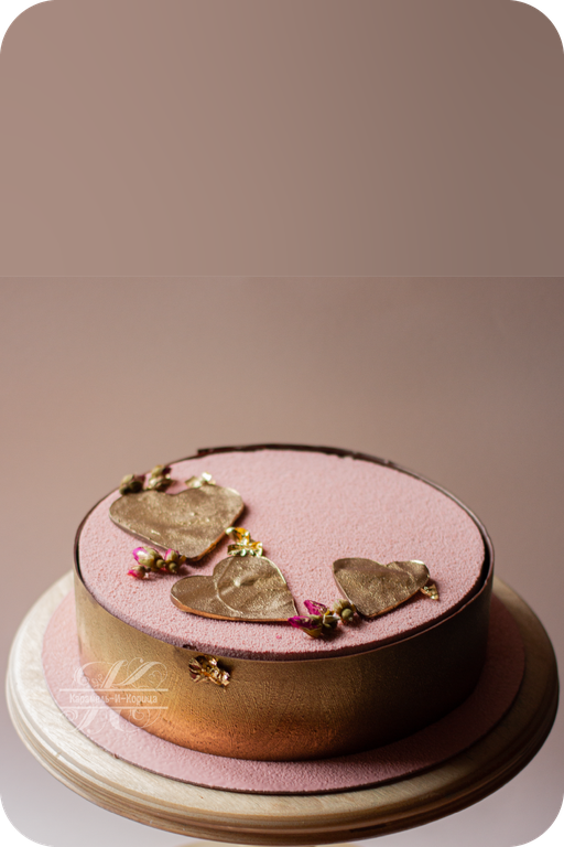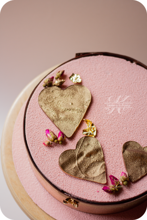Покрытие велюр (цвет на выбор), шоколадные сердца покрытые золотым кандурином, сушеные розовые бутоны, пищевое золото, шоколадный борт.