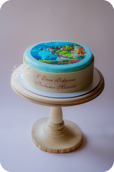 Покрытие глазурь (цвет на выбор), шокотрансферный рисунок (на выбор), шоколадный бортик с надписью.