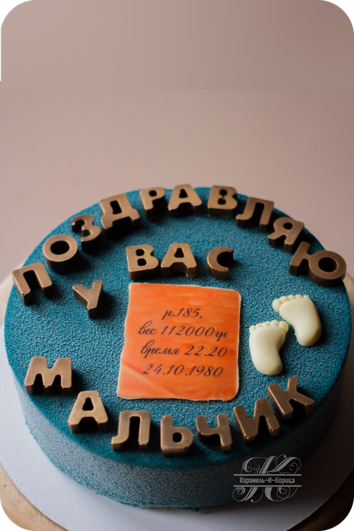 Покрытие велюр синего цвета (цвет на ваш выбор), шокотрансферная открытка с надписью (на выбор), шоколадные буквы(надпись на выбор), декор"пяточки".