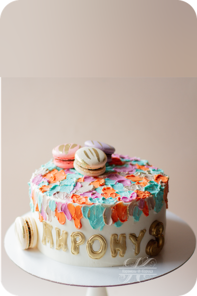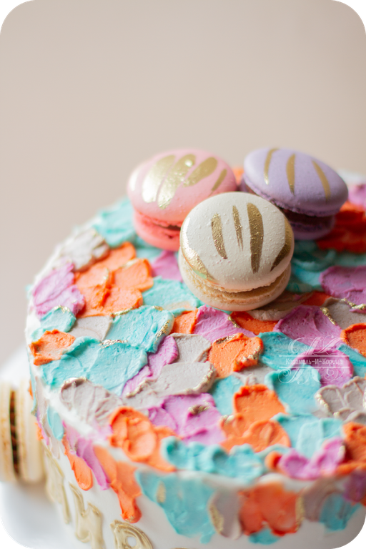 Кремовые мазки , шоколадная надпись покрытая золотым кандурином. Пирожные макаронс. Цвет покрытия и мазков на ваш выбор.