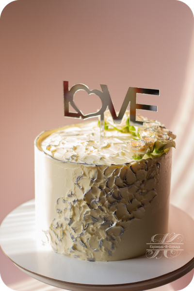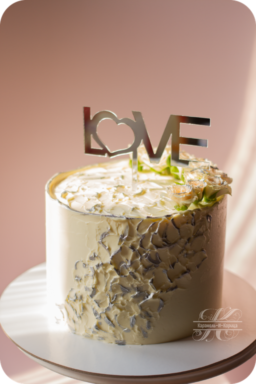 Покрытие ганаш со скульптурными мазками, пищевое серебро, живые розы, акриловый топпер.