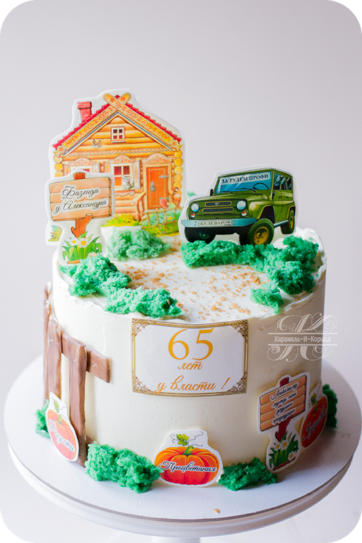Печать на сахарной бумаге, "трава"- бисквит мох, фигурка мастичная — забор, вафельная крошка.