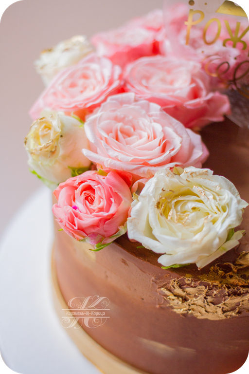 Живые розы, топпер, цветные мазки, сахарные бусины (надпись на топпере, цвет мазков, цвет роз на ваш выбор).