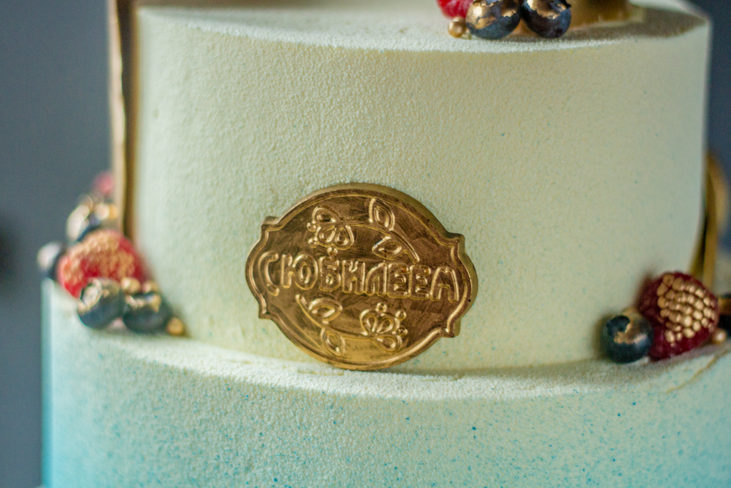 Шоколадные паруса, покрытые пищевым красителем Золото, шоколадная табличка "С Юбилеем", ягоды, пирожные макаронс.